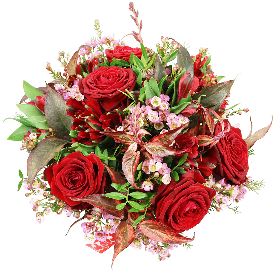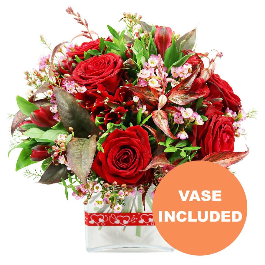 This unique arranged bouquet made up of red roses, red alstroemeria, wax flowers, pistacia and red greenery will charm everyone just from the first sight! Vase included.