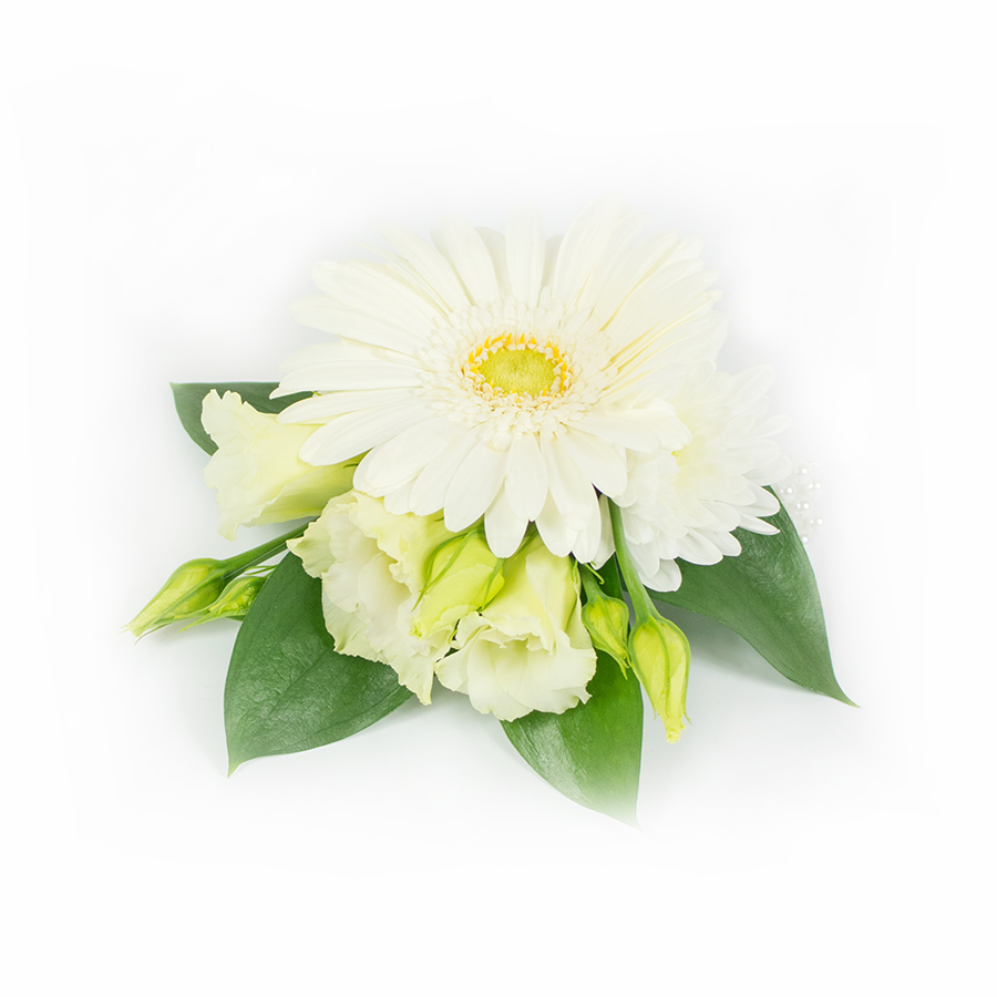 This pearly white combination of gerbera, alstroemeria and chrysanthemums wrist corsage exudes class and style. Lovely addition to any prom, bridesmaid, or bridal dress. Placed over a pearl bracelet, the flowers bring forth a stunning look.