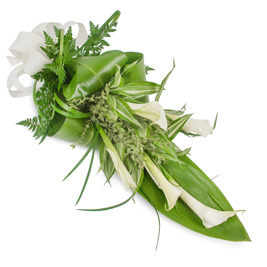Show your deep sympathy and caring thoughts with a wonderful arrangements made of elegant white calla lilies. They are richly complemented with lush greenery to convey a feeling of serenity and peace.