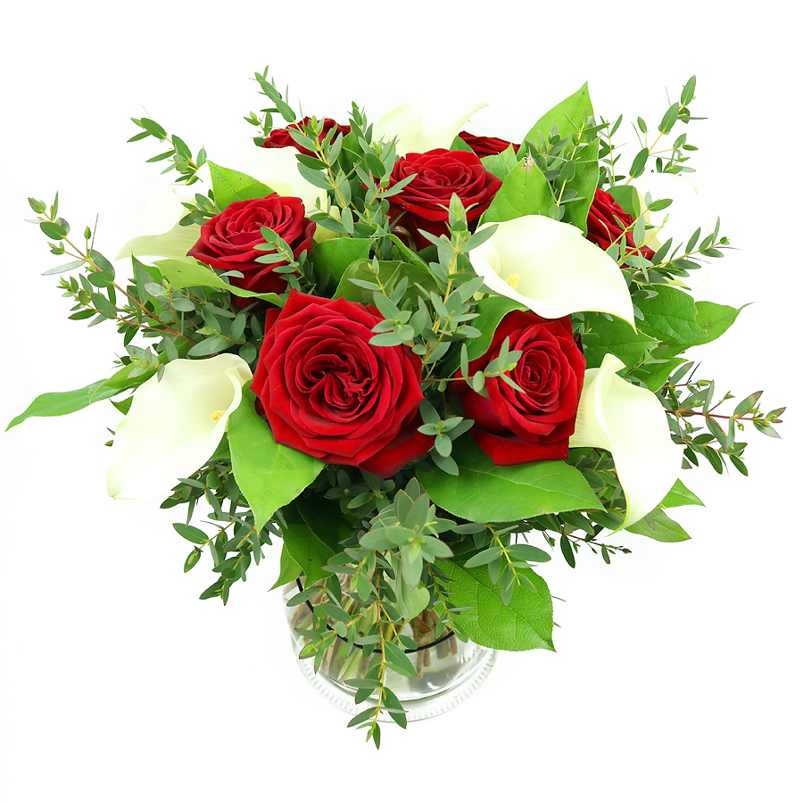 Discover the lush beauty of our bouquet, combining vibrant red roses with pristine white calla lilies, enriched with fresh greenery and ruscus. Each flower is hand-selected to ensure maximum freshness and quality.