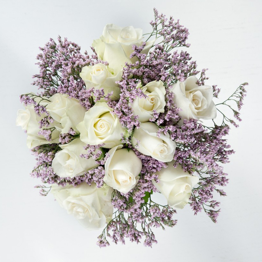 Exquisite White Roses and Purple Limonium Bouquet