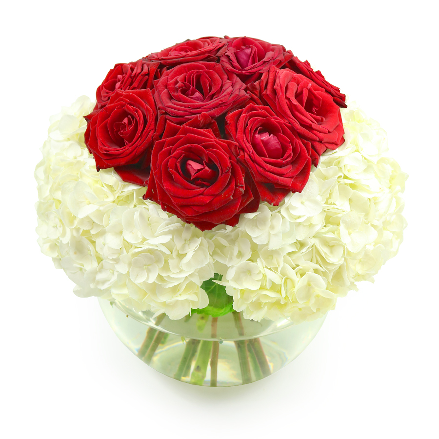 Discover the beauty of our bouquet, a floral symphony combining vibrant red roses with elegant white hydrangeas. Each bloom is hand-selected to ensure exceptional quality and freshness, creating a unique and captivating arrangement.
