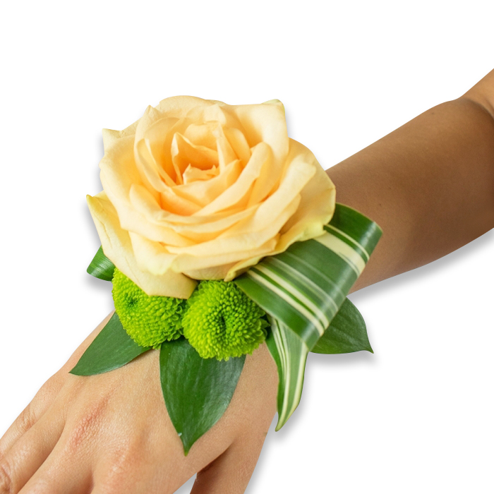 This touch of pale organge rose and green crysanthemum is the ideal combination of fresh flowers for a sun kissed finish to your bridal entourage.